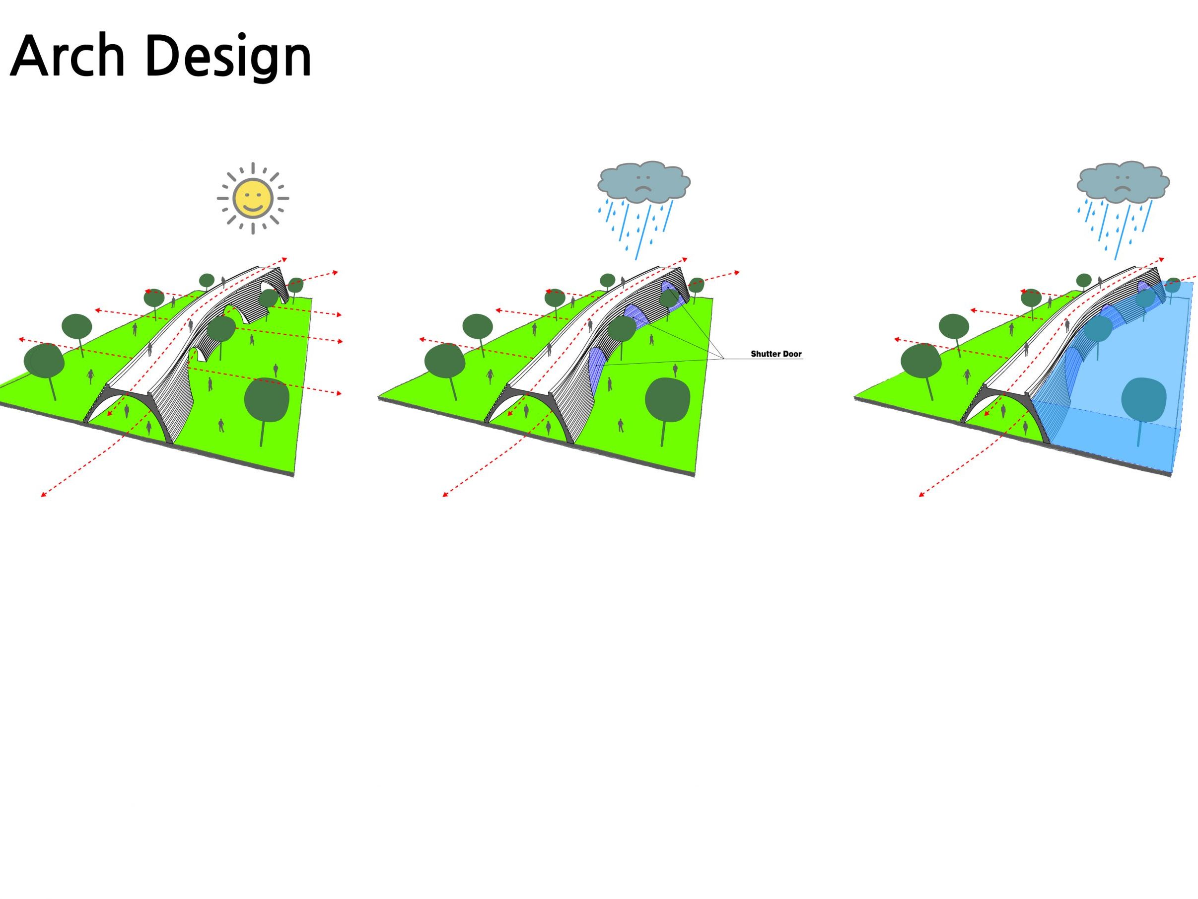 기상이변으로 강물이 범람하며 눈,비나 강한 바람이 있으면 이용이 쉽지가 않다. 기존 행위들을 그대로 받아 들이면서도 바람과 수면상승에도 유연하게 대처하며 4계절 이용이 가능한 패차가능한 아치 터널을 계획했다.
