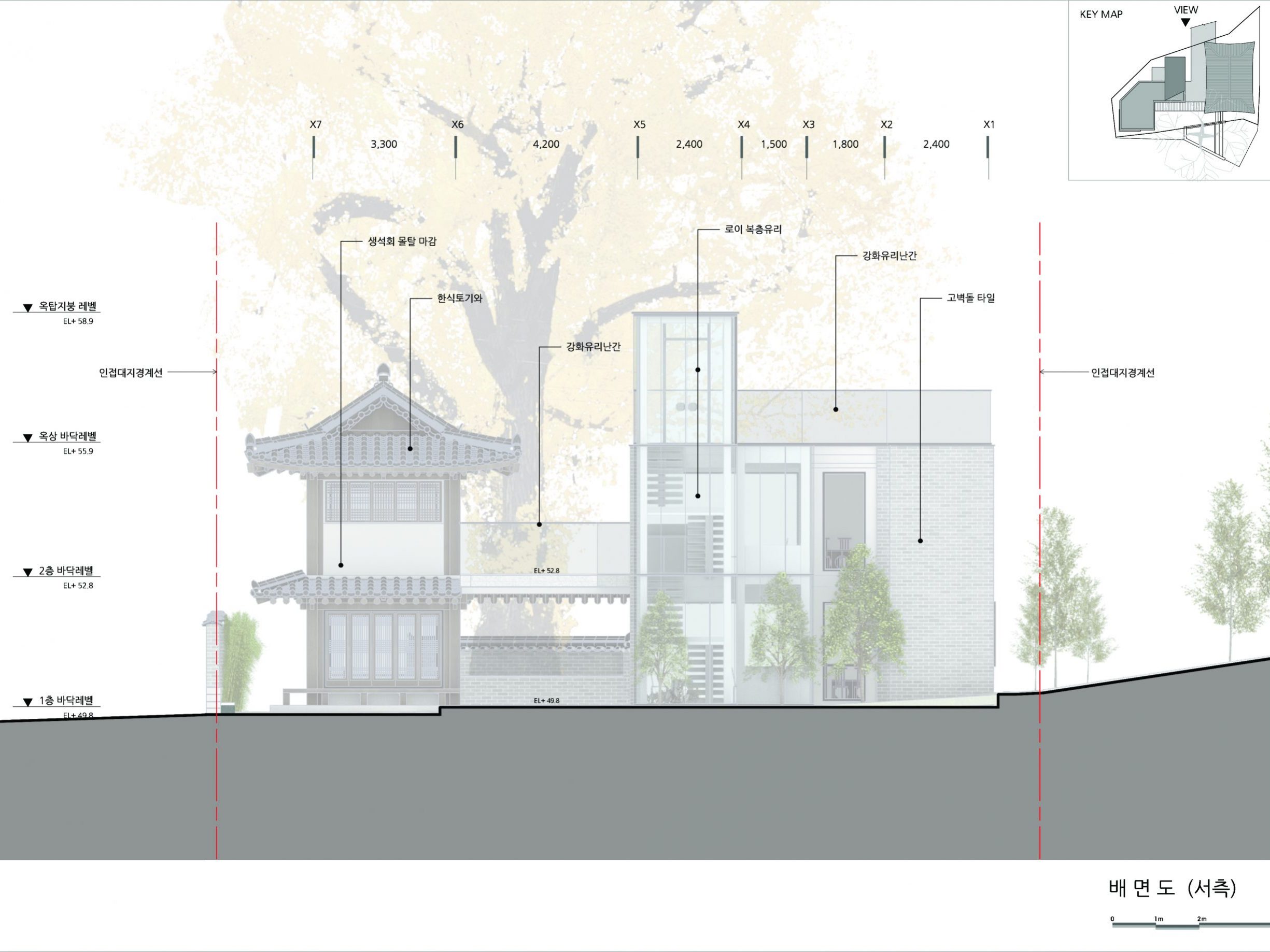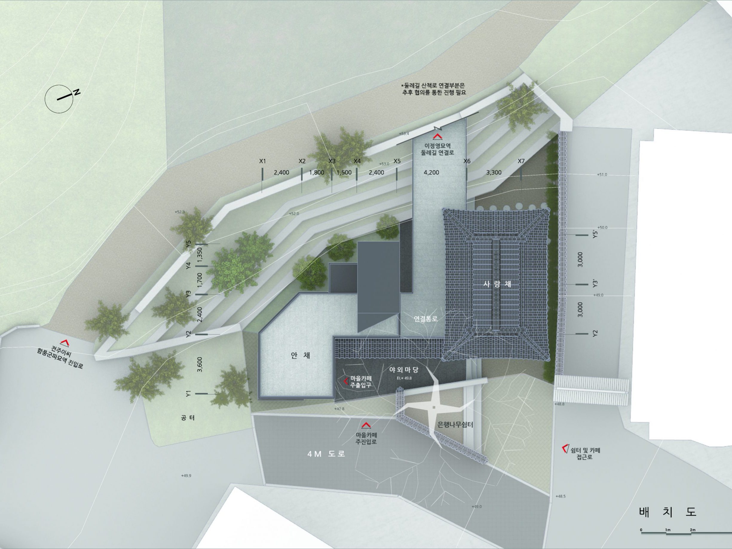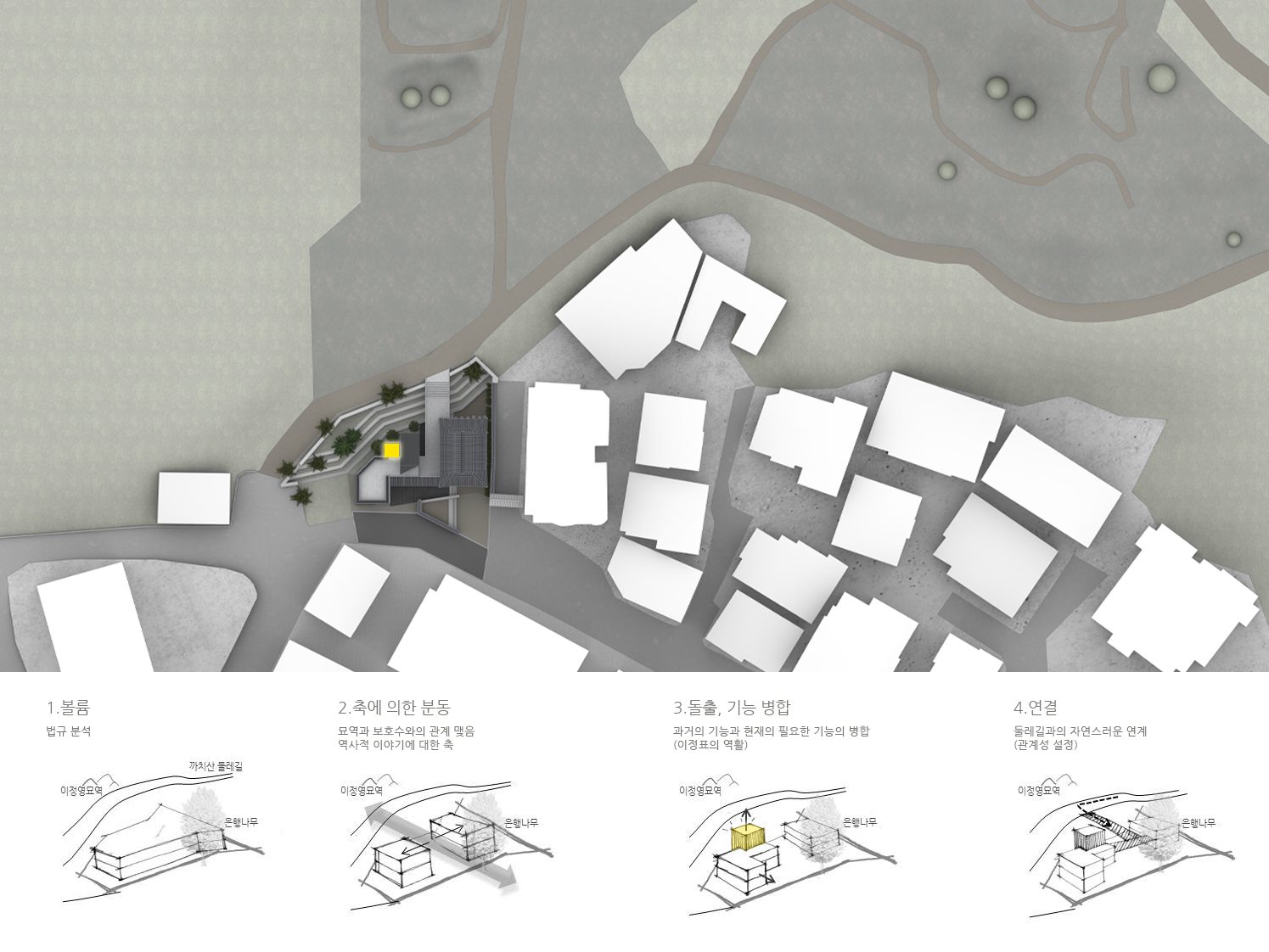 과거의 이야기와 기능에 의해 형성된 역사축을 기반으로 공간의 비워냄을 통해 과거와 현재를 연결하였다.
