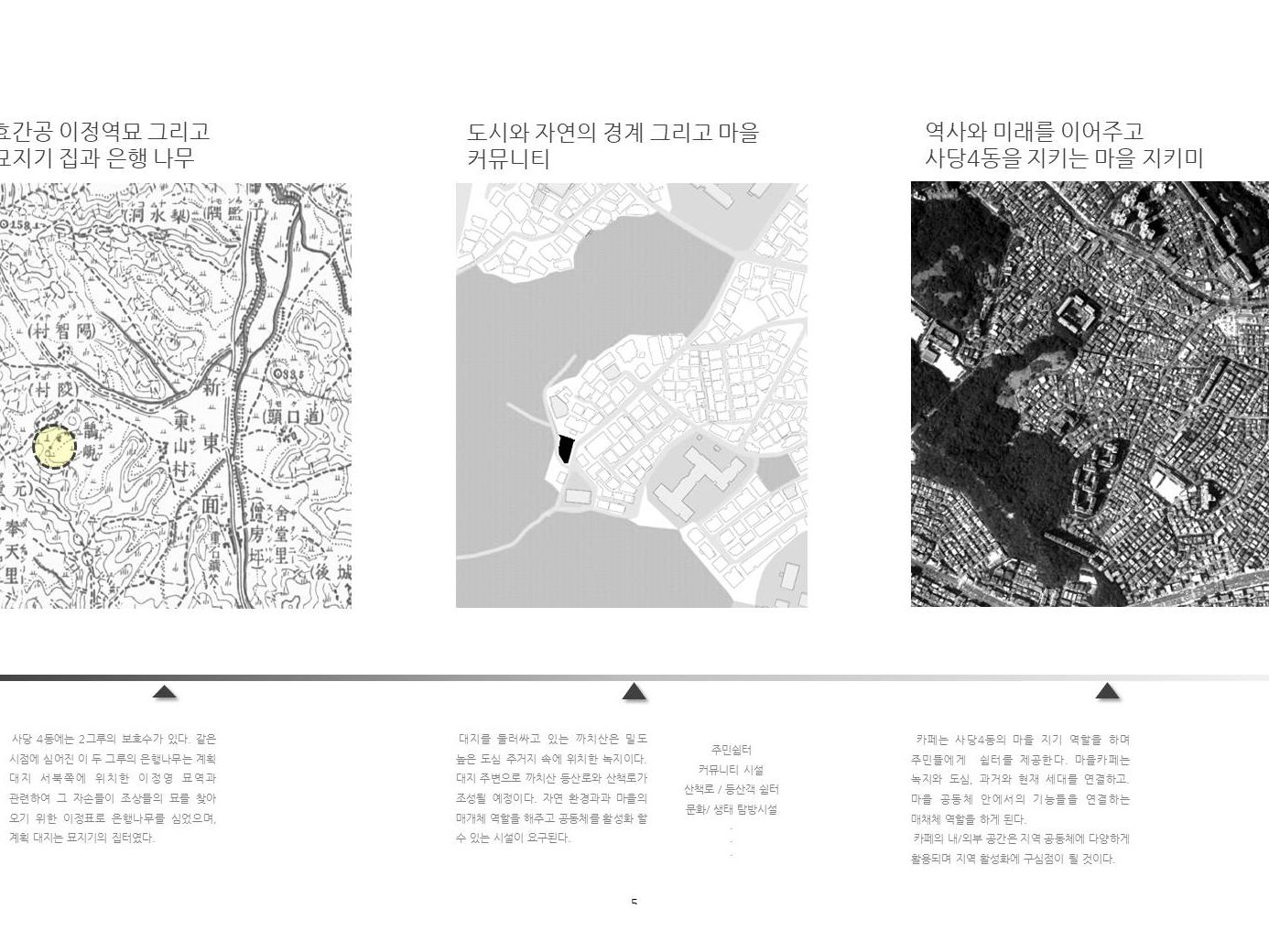 이정표의 역할을 하고 묘를 지키던 사람이 살던 곳. 이 곳에 우리는 오고 가는 세대들에게 효간공 이정영의 역사를 비롯해 과거의 기능이 투영되어 묘지기를 넘어 마을지기의 역할을 하는 공간을 만들고자 했다. 신한옥과 모던한 건축물의 조화로 전 세대가 향유할 수 있는 소통의 공간이 될 것이다. 땅의 역사와 이야기를 반영한 건축계획은 자연과 어우러져 경관으로 다가와 풍경으로 자리잡아 사당4동의 마을지기가 될 것이다.