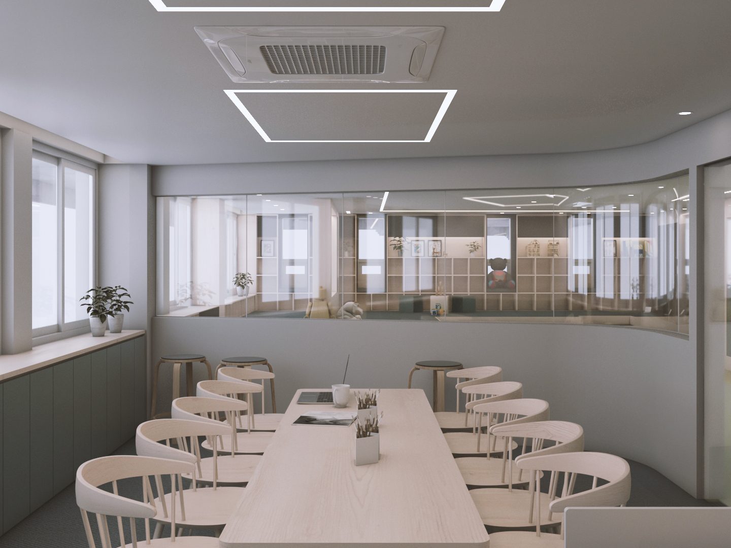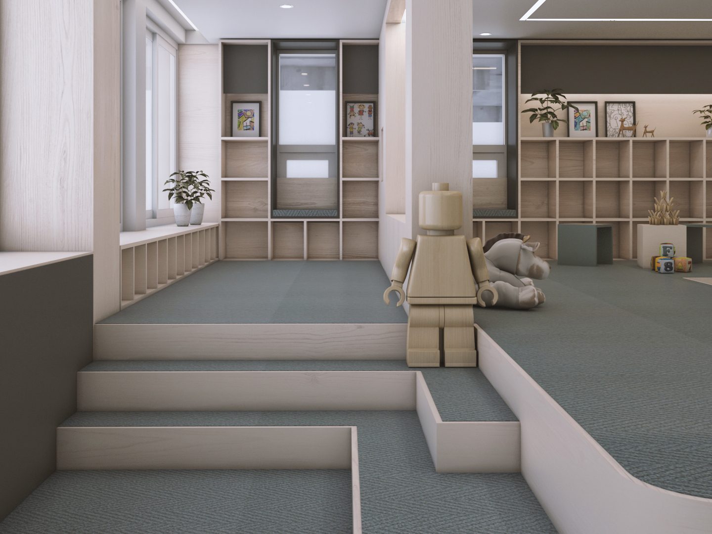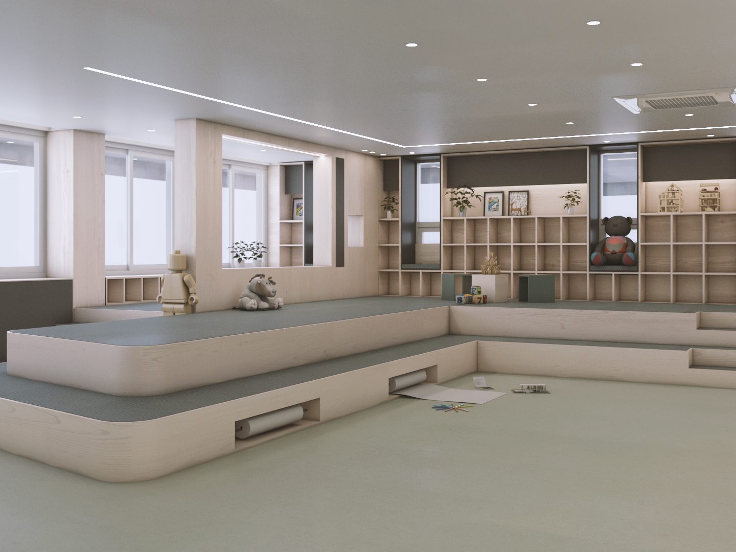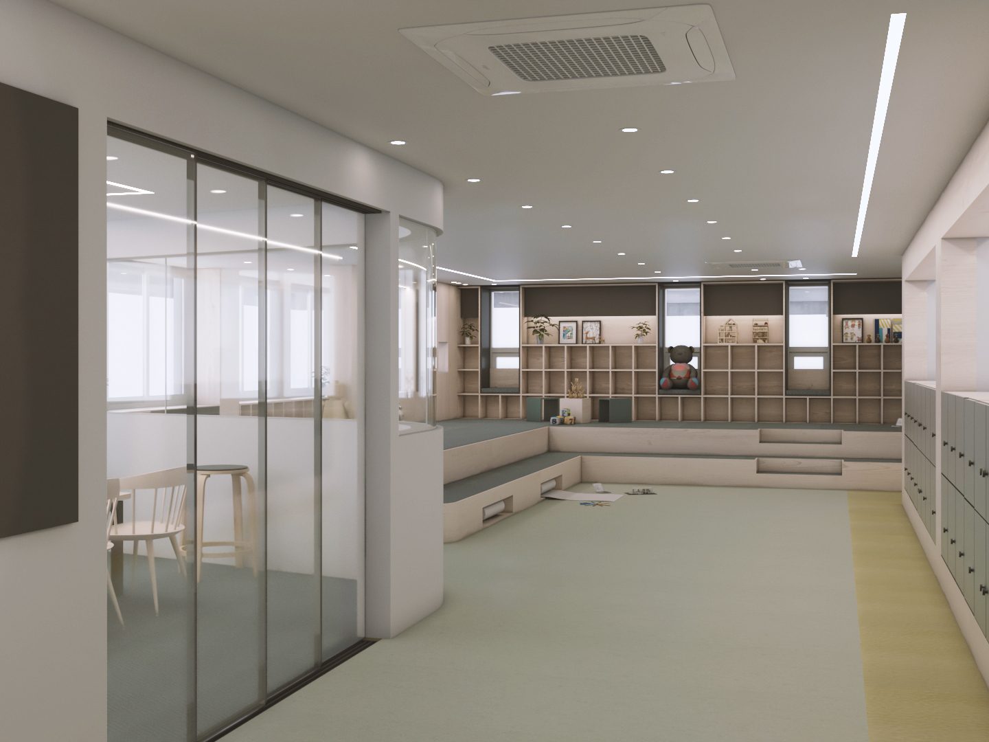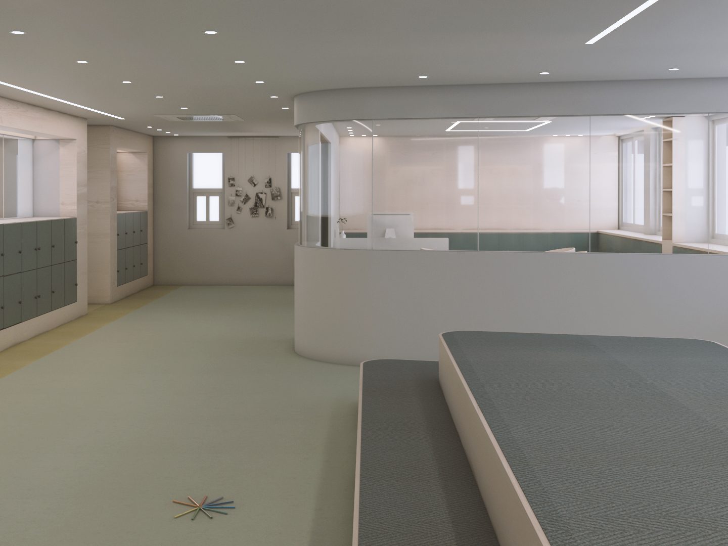 정적공간과 동적공간이 같은 공간에서 존재해야 했고 아이들의 안전을 위해 선생님의 시야에 모든 공간이 들어와야 했다. 복합적 요소를 고려해 정적공간과 동적공간의 경계에 라운드 벽과 창을 두어 아이들의 안전과 시각적 경쾌함을 동시에 만들 수 있었다. 이 곳을 오가는 많은 이들이 언제나 즐겁기를 바란다.